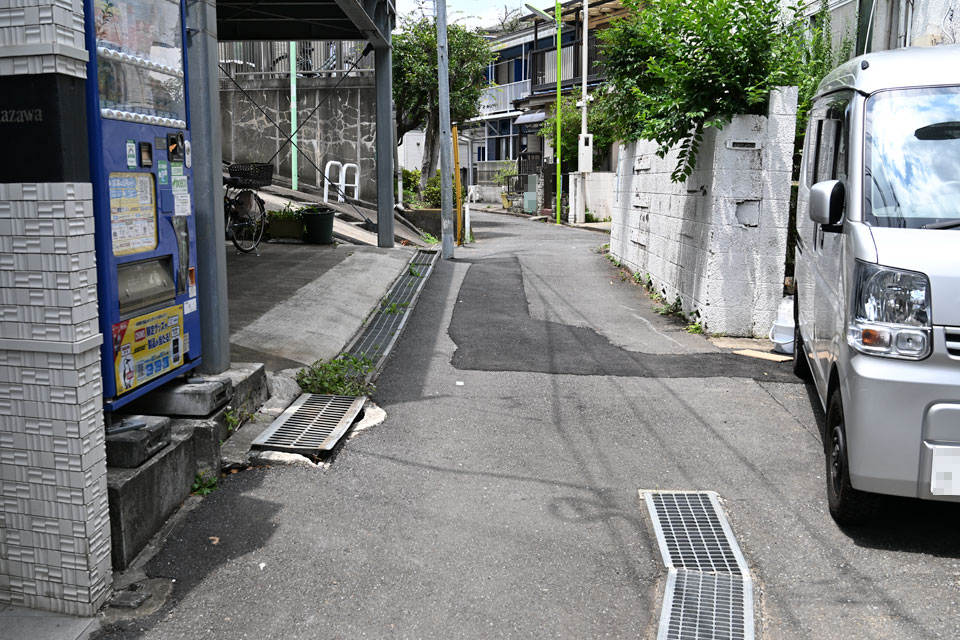 狭い水路跡を出ると、道路の西側は駐車場脇の蓋暗渠となる。