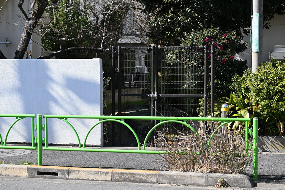 狭くなった道を丸子川に向かっていくと、高校敷地の北側に怪しいフェンスを発見。