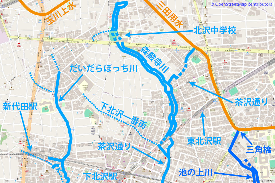 北沢川は上北沢の松沢病院付近に水源を持ち、玉川上水から分水を得て世田谷区内を流れていた川で、池尻で烏山川と合流して目黒川になっている。