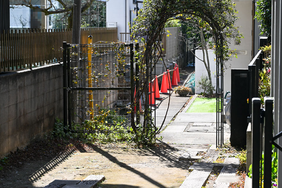 北側の丸子川沿いまで回ってみると、民家脇に蓋暗渠があるのが見える。写真手前では蓋暗渠は失われているが、水路敷としては丸子川とつながっているようだ。