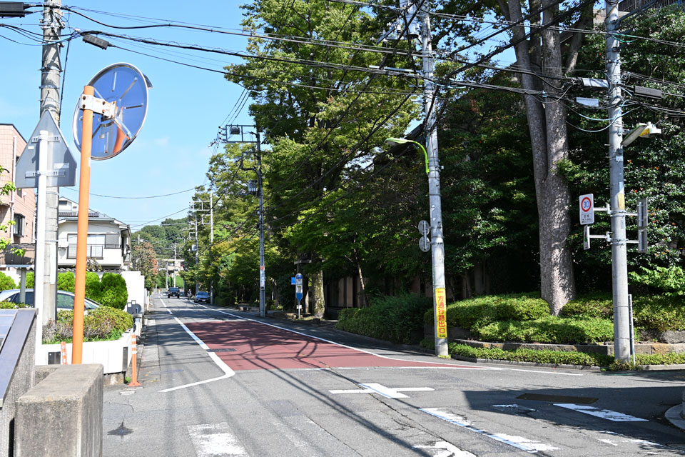 大蔵通りが丸子川を渡る下山橋から南に通りを見たところ。地籍図では道路右(西)に水路敷が描かれており、幅の広い路肩がそれっぽいところだ。