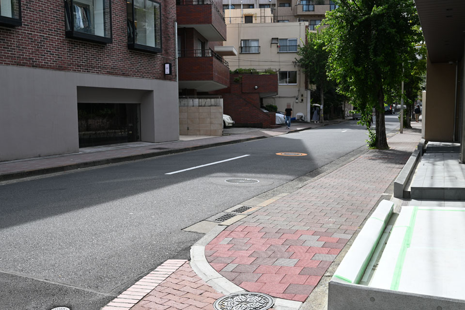 こちらは松濤文化村ストリートから北寄りに分かれている松濤公園通りを西(写真右奥)から流れてきて、写真の位置で曲がってさきほどのインターロッキング舗装の道路に向かっていた。